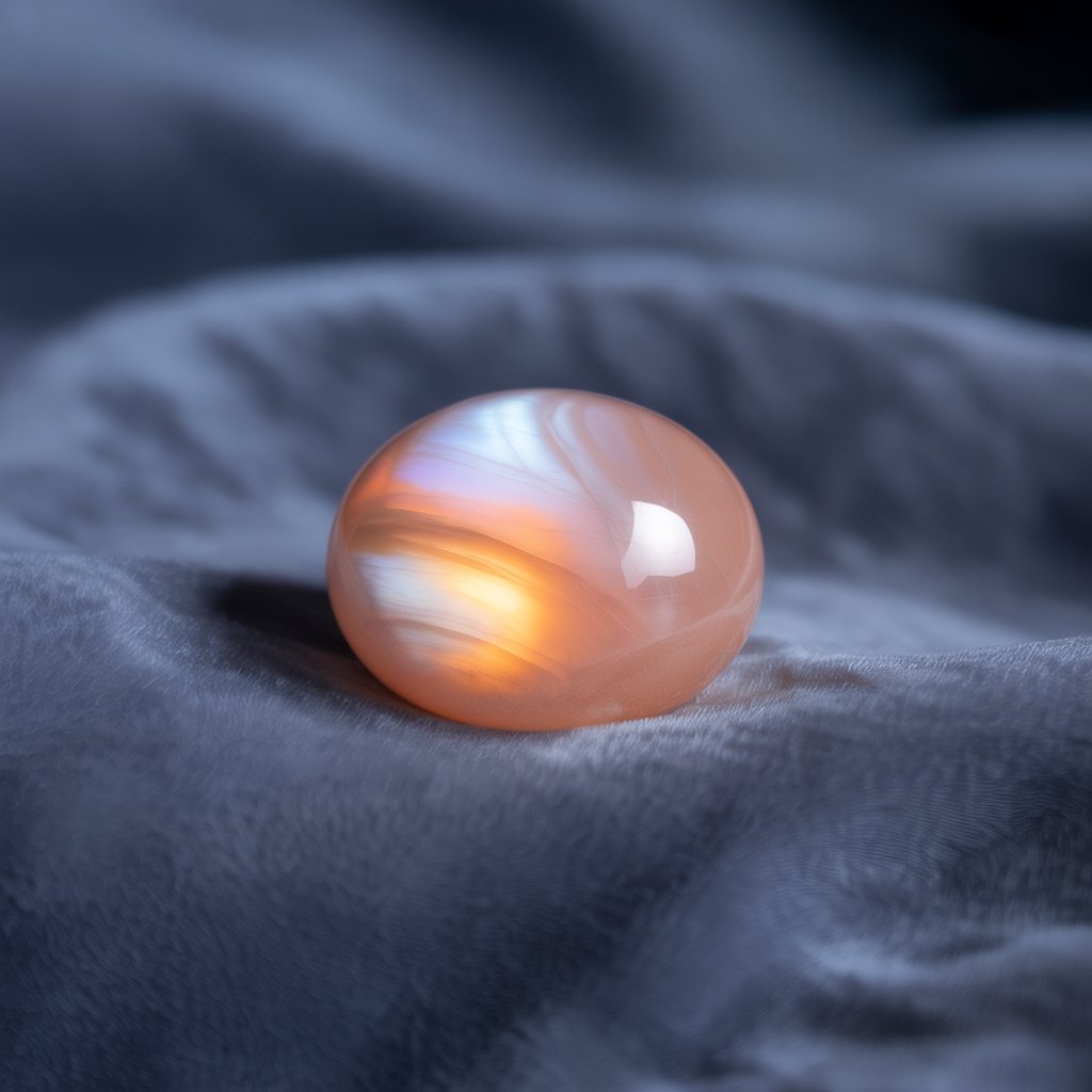 - 빛 반사 특성: 문스톤 특유의 쉐퍼드렌시(Schiller effect) 또는 아데울라레선스(Adularescence) 현상이 피치 문스톤에도 나타나는데요. 이는 빛이 표면을 스치듯 흐르며 은은하게 빛나는 현상으로, 마치 달빛이 안갯속에서 퍼지는 듯한 느낌을 줍니다.
